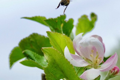 Apfelblüte mit fliegender Biene